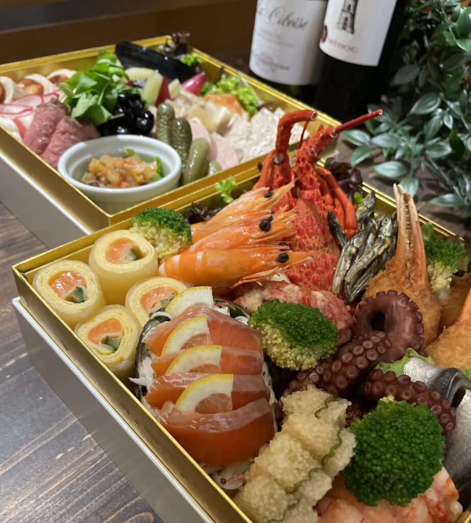 ≪伊勢海老や蟹などの海鮮のお重≫と≪多彩なお肉料理のお重≫の豪華二段重のセットです